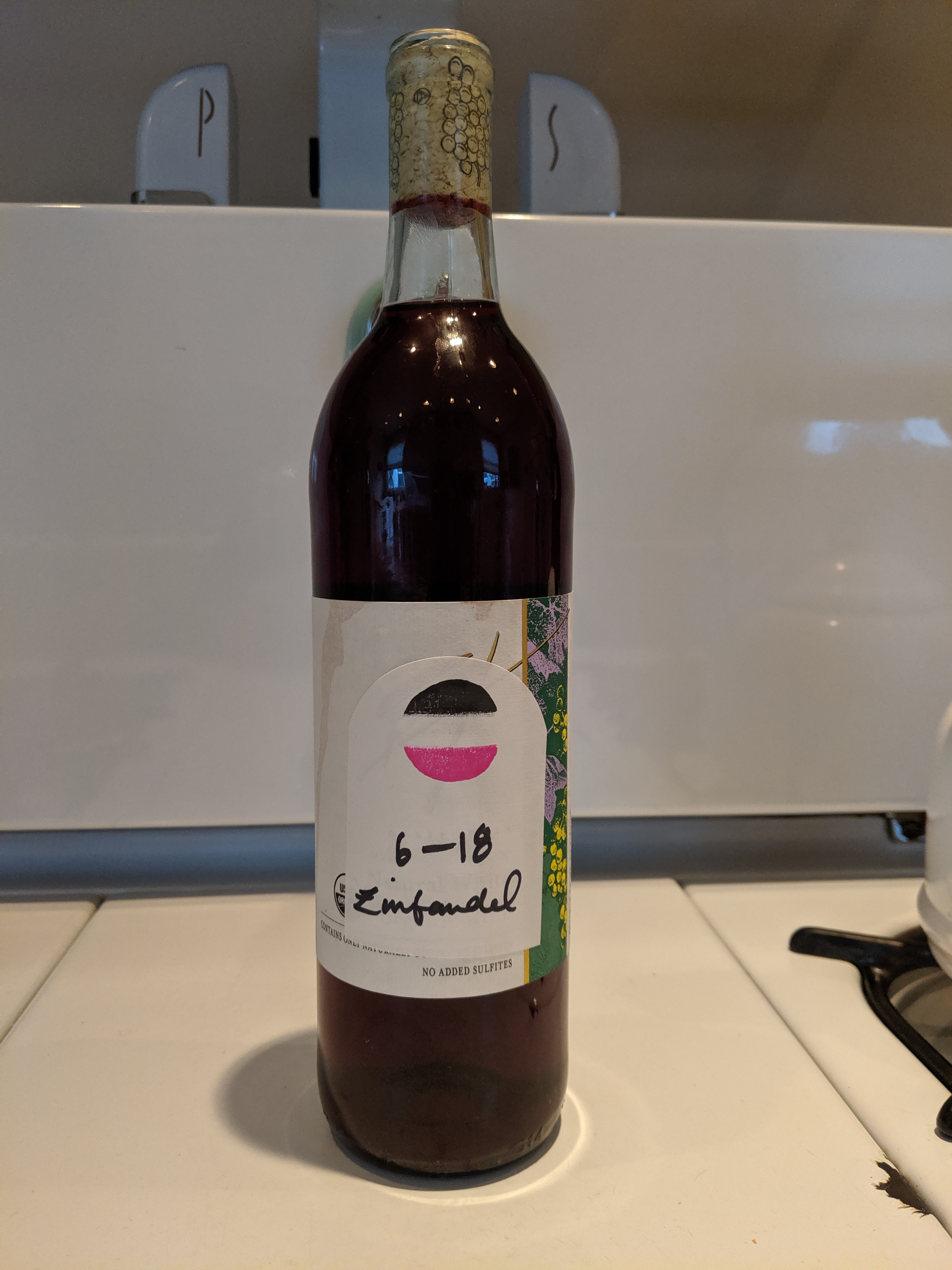 I didn’t want to top up with Carlo Rossi, or the closest to cheap, bulk wine that I could find. I wanted something that would minimally mess with any further development that it still had to go through, so stuff loaded with additives wasn’t in the picture. I visited one of our local natural wine–focused spots, Terroir, and their bartenders recommended the cheapest, no-added-sulfites red blend containing Zinfandel that they were able to think of. I’m sadly forgetting the brand.