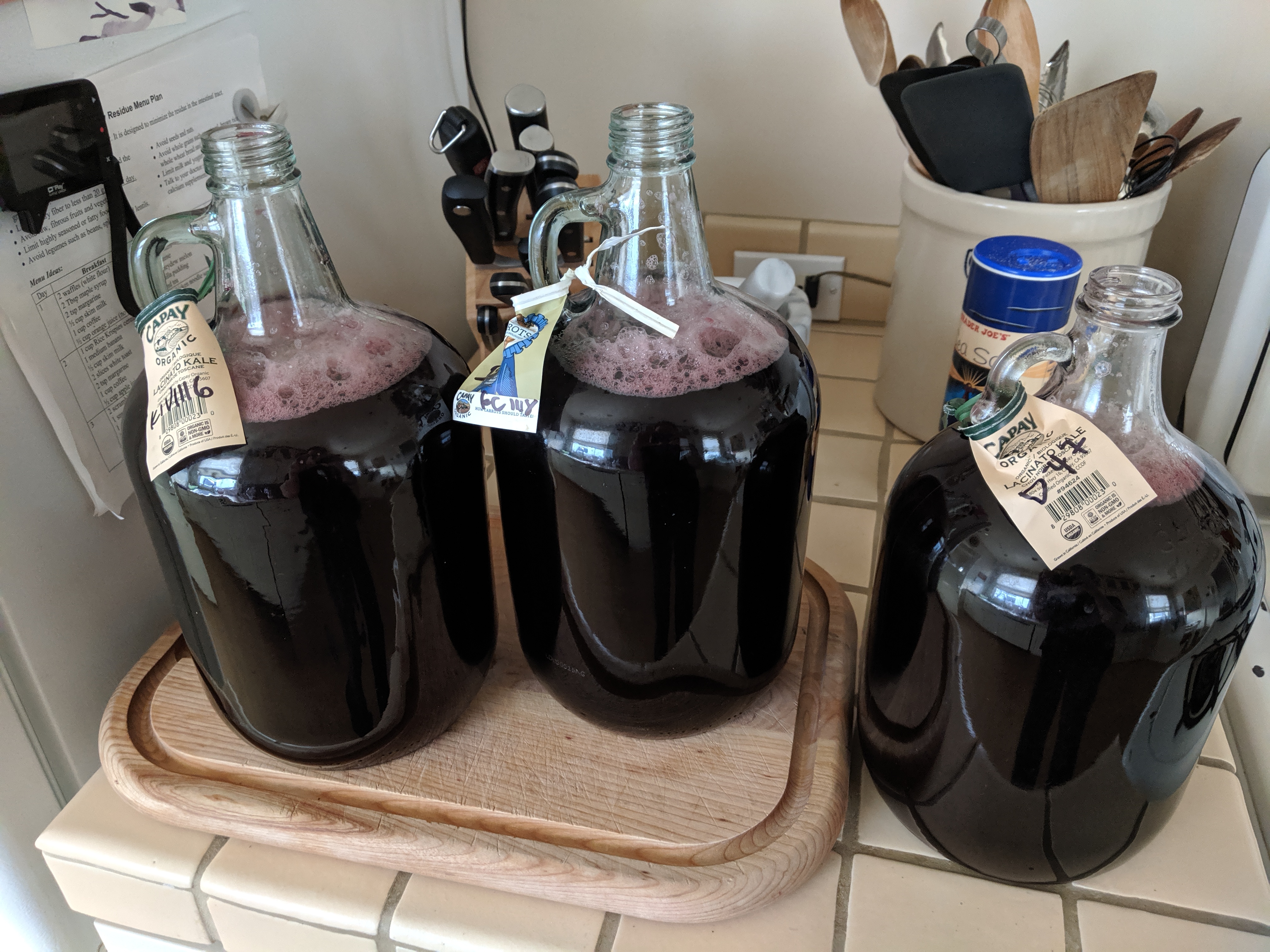 I got things going yesterday afternoon in a pair of ex-Carlo Rossi jugs and a third 1 gallon jug I have. I poured the juice into them, rehydrated the yeast, and pitched it into the labeled jugs. I’m going to leave the airlocks off until things get going in there to give the yeast some access to oxygen to spur activity. (Also, turns out my #7 stoppers don’t fit the Carlo Rossi jugs, so I’m off to the homebrew store again today.)
